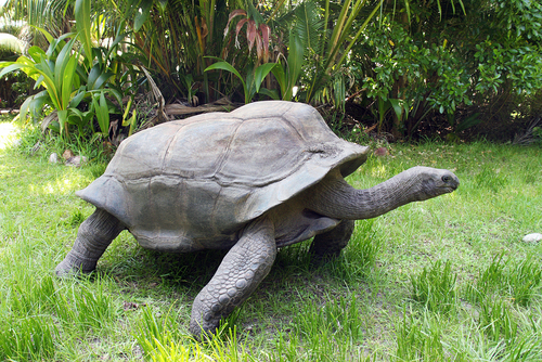 As the largest animal in its environment, the Aldabra tortoise performs a role similar to that of the elephant. Their vigorous search for food fells trees and creates pathways used by other animals.