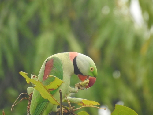 The Alexandrine parakeet lives in forests, woodlands, agricultural lands and mangrove forests at elevations of up to . It eats a variety of wild and cultivated seeds, buds, fruits and nuts. Flocks can cause extensive damage to ripening fruits and grain crops like maize and jowar. It usually lives in small flocks, but forms larger groups in areas where food is abundant or at communal roosts.