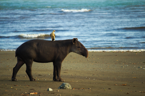 The Baird's tapir has a symbiotic relationship with cleaner birds that remove ticks from its fur: the yellow-headed caracara (Milvago chimachima) and the black vulture (Coragyps atratus) have both been observed removing and eating ticks from tapirs. Baird's tapirs often lie down for cleaning, and also present tick-infested areas to the cleaner birds by lifting its limbs and rolling from one side to the other.