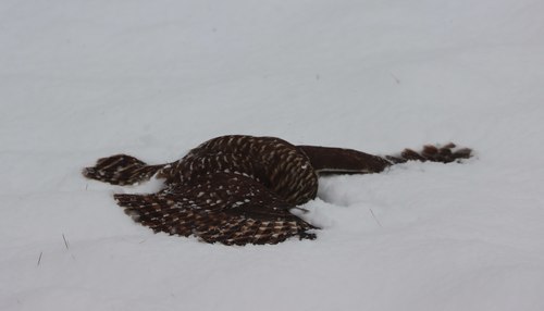 The barred owl, like most owls, is largely adapted to nocturnality. Peak times in Minnesota were found to be right after sunset and just before dawn. Nonetheless, they are not as fully nocturnal as many owls and rank around 6th amongst 19 regular North American owl species for the regularity of their activity outside of nightfall, especially in particular circumstances such as when a rival or a human impersonator is emitting barred owls calls or whilst hunting. Often daytime activity tends to be early in the morning or around dusk but potentially at any time (overcast days being preferred). This species often spends the daytime hidden away in the dense foliage of a tree, often at minimum above the ground, but sometimes also roosts in a branch close to a broad trunk or in a natural tree hollow. Recently fledged owls sometimes roost in tall grass, usually after falling from the nest tree. They seldom rely on camouflage, instead often flying at the least disturbance and not allowing close approaches, making them potentially difficult to observe. There are some records of barred owls engaging in allopreening, presumably between pairs, with each other in the wild. They are skilled and silent fliers and frequently use routine forest flyways with open understory and low branch densities. In tawny owls in a study from Italy, for instance, they responded mildly or not at all to the calls of neighboring tawny owls known to them but with great aggression to the calls of "stranger" owls. Due to its rather stolidly territorial nature, the barred owl is not normally a migratory species. There is little to no evidence of nomadic behavior as has been recorded in several other owls in the north.
