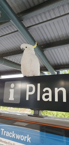 visiting a balcony in eastern Sydney for bird seeds|alt=A cockatoo is perched on a city balcony several floors above the ground. A suburban landscape is in the background.]]