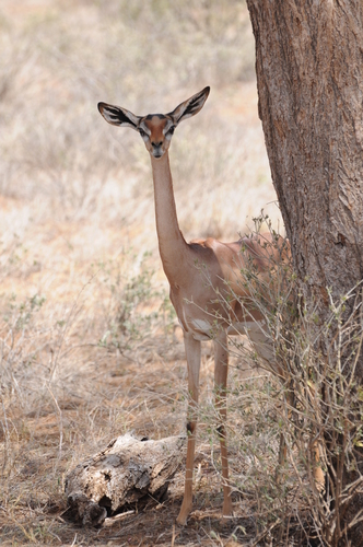 The gerenuk (Litocranius walleri), also known as the giraffe gazelle, is a long-necked, medium-sized antelope found in parts of East Africa. The sole member of the genus Litocranius, the gerenuk was first described by the naturalist Victor Brooke in 1879. It is characterised by its long, slender neck and limbs. The antelope is 80–105 centimetres (2 feet 7 inches – 3 feet 5 inches) tall, and weighs between 18 and 52 kilograms (40 and 115 pounds). Two types of colouration are clearly visible on the smooth coat: the reddish brown back or the "saddle", and the lighter flanks, fawn to buff. The horns, present only on males, are lyre-shaped. Curving backward then slightly forward, these measure 25–44 cm (10–17+1⁄2 in).