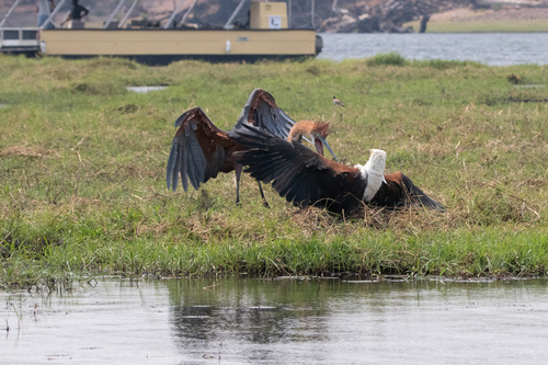 Goliath herons are solitary foragers and are highly territorial towards other herons entering their feeding territories. On occasions, two may be seen together but these are most likely to be a breeding pair or immatures. A diurnal and often rather inactive feeder, this heron often hunts by standing in the shallows, intently watching the water at its feet. This is a typical feeding method among large Ardea herons and it can forage in deeper waters than most due to its larger size. It may also perch on heavy floating vegetation, to prevent water from rippling around them. As prey appears, the heron rapidly spears it with open mandibles, often spearing both mandibles through the fish's body, and then swallows it whole. It is possible that the bill is used in a lure-like fashion occasionally, attracting fish to the static, large object submerged in the water. The handling period is long, with herons often placing their struggling prey on floating vegetation while preparing to swallow it. Due to its generally slow movements and handling time, the goliath is frequently vulnerable to kleptoparasitism. In Africa, African fish eagles frequently pirate food caught by goliaths, although other large birds such as saddle-billed storks and pelicans may also steal their prey.