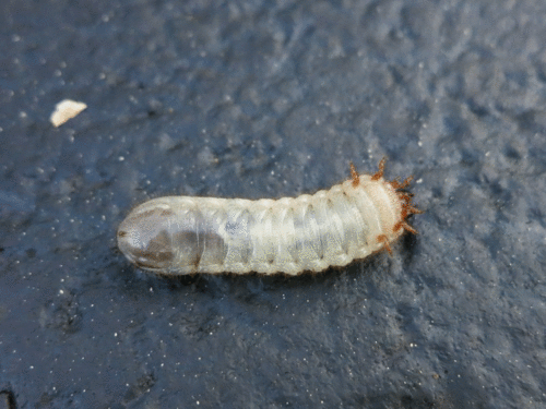 The grubs will grow to about and are white with a brownish-black head and brown spiracles along the sides of the body. The larvae will molt twice before winter. The fully grown larva color is glassy yellowish white shading toward green or blue at the head and tail. The larva has stiff ambulatory bristles on its abdomen which assist movement. The larva normally travels on its back. The underground speed is considered more rapid than any other known genus of Scarabaeidae in the United States and is comparable to that of the hairy caterpillar. The larvae feed largely on humus and mold but can do considerable damage to plant root systems. Injury has been reported to vegetables and ornamental plants, particularly those which have been mulched. The larvae are considered pests when they cause damage to lawns or turf grasses. The insect is considered more injurious in its larval stages than as a beetle. Pupation occurs after the third larval stage, which lasts nearly nine months. The pupal stage occurs in an oval cocoon constructed of dirt particles fastened together by a viscid fluid excreted by the larva. The pupa is white when first formed but develops greenish tints just before emergence.