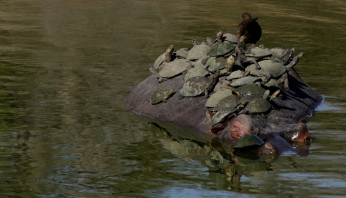 A hippopotamus and Nile crocodile side by side in Kruger National Park