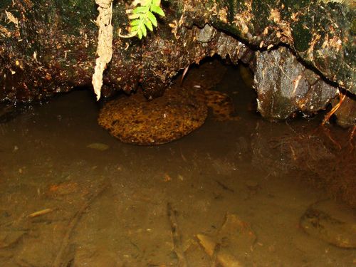 The Japanese giant salamander remains in bodies of water its entire life. During the mating season, typically in late August and early September, sexually mature males start actively finding suitable nesting sites and often migrate upstream into smaller sections of the river or its tributaries. Because of the limited availability of suitable nesting sites, only large and competitive males are able to occupy nesting sites and become den masters. A den master diligently cleans his den and guards his den against intruders, including other males who try to steal the den, while allowing a sexually active female to enter the den. Mating begins as the female starts laying eggs and the den master starts releasing sperm, which often stimulates other subordinate males hiding around the den to enter the den and join the mating. As a result, a single female often mates with multiple males. The den master stays in the den with the fertilized eggs while the other males and the female leave the den. He provides parental care for the embryos by guarding the eggs and fanning water over them with his tail to increase oxygen flow. As the den master kicks his back legs and fans with his tail, organic debris is swept out of the nest and carried away from the nest by the water current. If this behavior were not performed, organic material would build up in the nest and lead to water mold infection. Therefore, the behavior is classified as pre-ovipositional parental care. The den master continues providing parental care for the hatchlings until the following spring when the larvae start dispersing from the nest. Researchers also observed that den masters consumed eggs and larvae that showed the sign of failed fertilization, death, or water mold infection. The researchers termed the behavior of selectively eating his own eggs or larvae "hygienic filial cannibalism" and hypothesize that this behavior importantly increases the survivorship of the remaining offspring by preventing water mold infection on the dead offspring from spreading to the healthy offspring.