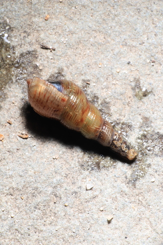 This species has an elongated, conical shell, which is usually light brown, marked with rust-colored spots.