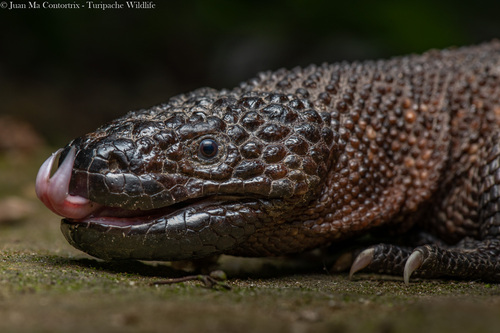 The Mexican beaded lizard or beaded lizard is a species of lizard in the family Helodermatidae, one of the two species of venomous beaded lizards found principally in Mexico and southern Guatemala. It and the other members of the same genus, including the Gila monster, are the only lizards known to have evolved an overt venom delivery system. The Mexican beaded lizard is larger than the Gila monster, with duller coloration, black with yellowish bands. As it is a specialized predator that feeds primarily upon eggs, the primary use of its venom is still a source of debate among scientists. This venom has been found to contain several enzymes useful for manufacturing drugs in the treatment of diabetes, and research on the pharmacological use of its venom is ongoing.