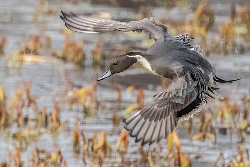 The northern pintail's breeding habitat is open unwooded wetlands, such as wet grasslands, lake shores or tundra. In winter, it uses a wider range of open habitats, such as sheltered estuaries, brackish marshes and coastal lagoons. It is highly gregarious outside the breeding season, forming very large mixed flocks with other ducks.