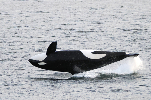An orca leaps out of the water when swimming—a behaviour known as porpoising—in Hood Canal