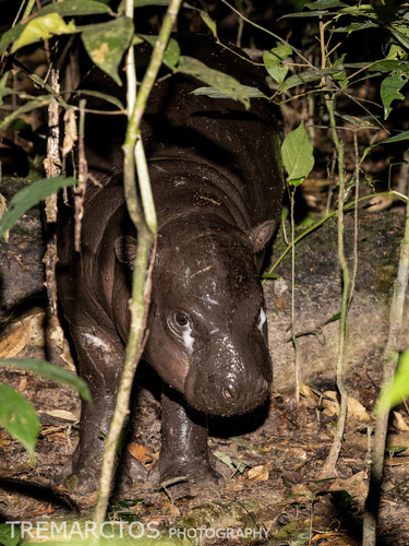 The behavior of the pygmy hippopotamus differs from the common hippo in many ways. Much of its behavior is more similar to that of a tapir, though this is an effect of convergent evolution. While the common hippopotamus is gregarious, pygmy hippos live either alone or in small groups, typically a mated pair or a mother and calf. Pygmy hippos tend to ignore each other rather than fight when they meet. Field studies have estimated that male pygmy hippos range over , while the range of a female is ., Singapore|left]]Pygmy hippos spend most of the day hidden in rivers. They will rest in the same spot for several days in a row, before moving to a new spot. At least some pygmy hippos make use of dens or burrows that form in river banks. It is unknown if the pygmy hippos help create these dens, or how common it is to use them. Though a pygmy hippopotamus has never been observed burrowing, other artiodactyls, such as warthogs, are burrowers.