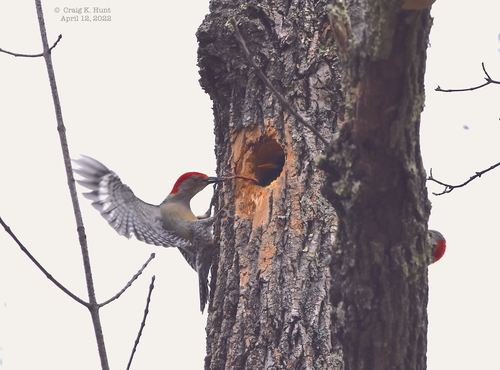 In early May, the red-bellied woodpeckers begin breeding activities by drumming patterns, such as slow taps followed by short rapid drumming. The red-bellied woodpeckers use vocal signals to attract and communicate with potential mates. The red-bellied woodpecker excavates holes in trees for nesting and roosting. By excavating cavities, they play an important role in forest communities for other species as well. Recent studies have shown that these woodpeckers experienced low breeding due to cutting sites of dead trees; however, predators are still of main concern. The juvenile red-bellied woodpecker is ready to fledge at 24 to 26 days of age. Natal dispersal has been observed in juvenile red-bellied woodpeckers. The juvenile red-bellied woodpecker remains in its natal area for approximately 27 weeks after fledging. In some cases, the woodpecker may return to its natal area for breeding, depending on predation levels and food resources.