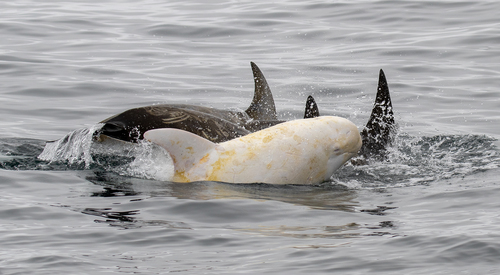 Another common name for Risso's dolphin is grampus (also the species' genus), although this common name was more often used for the orca. The etymology of the word "grampus" is unclear. It may be an agglomeration of the Latin ' or French , both meaning big fish. The specific epithet griseus refers to the mottled (almost scarred) grey colour of its body.