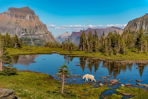 The mountain goat, also known as the Rocky Mountain goat, is a cloven-footed mammal that is endemic to the remote and rugged mountainous areas of western North America. A subalpine to truly alpine species, it is a sure-footed climber commonly seen on sheer rock faces, near-vertical cliffs and icy passages. Mountain goats generally avoid venturing down into lower elevations—except during seasonal food shortages or during particularly bad weather—as the extreme elevation of their habitat is the primary defense against predators such as black and brown bears, pumas and wolves.