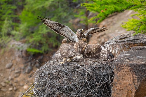 Rough-legged buzzards that survive to adulthood can live to an age of 19 years in the wild; however, perhaps a majority of individuals in the wild do not survive past their first two years of life. The threats faced by young rough-legs can include starvation when prey is not numerous, freezing when Northern conditions are particularly harsh during brooding, destruction by humans, and predation by various animals. The chances of survival increase incrementally both when they reach the fledging stage and when they can start hunting for themselves. Death of flying immatures and adults are often the result of human activity, including collisions with power lines, buildings, and vehicles, incidental ingestion of poison or lead from prey, or illegal hunting and trapping. Other reasons for nestling mortality are earth-slides of the river-banks, where rough-legged buzzards often build their nests, and chilling.