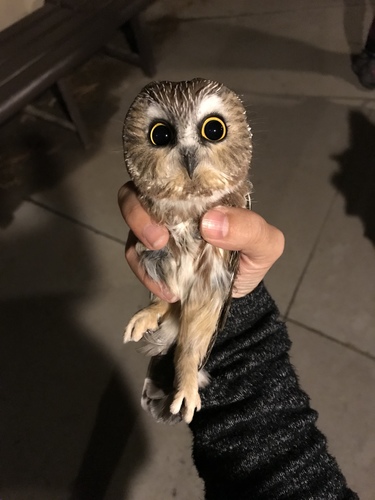 The northern saw-whet owl is a species of small owl in the family Strigidae. The species is native to North America. Saw-whet owls of the genus Aegolius are some of the smallest owl species in North America. They can be found in dense thickets, often at eye level, although they can also be found some 20 ft (6.1 m) up. Saw-whets are often in danger of being preyed upon by larger birds of prey. The northern saw-whet owl is a migratory bird without any strict pattern.