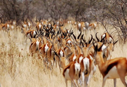 The historic range of the springbok stretched across the dry grasslands, bushlands, and shrublands of south-western and southern Africa; springbok migrated sporadically in southern parts of the range. These migrations are rarely seen nowadays, but seasonal congregations can still be observed in preferred areas of short vegetation, such as the Kalahari Desert.