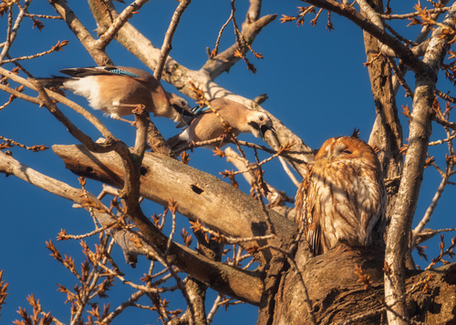 The tawny owl typically nests in a hole in a tree, but will also use old European magpie nests, squirrel drey or holes in buildings, and readily takes to nest boxes. It nests from February onwards in the south of its range, but rarely before mid-March in Scandinavia. The young usually leave the nest up to ten days before fledging, and hide on nearby branches.