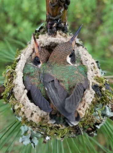 The white-eared hummingbird's breeding seasons vary with latitude, from March to August in the north to October through December in El Salvador. Males court in leks where they sing and display for females. The nest is a cup made of plant down with lichens on the outside. It is typically placed up to above the ground in a tree or shrub, and several nests may be short distances apart. The female incubates the clutch of two eggs for 14 to 16 days and fledging occurs 23 to 28 days after hatch. The species occasionally raises two broods in a season.